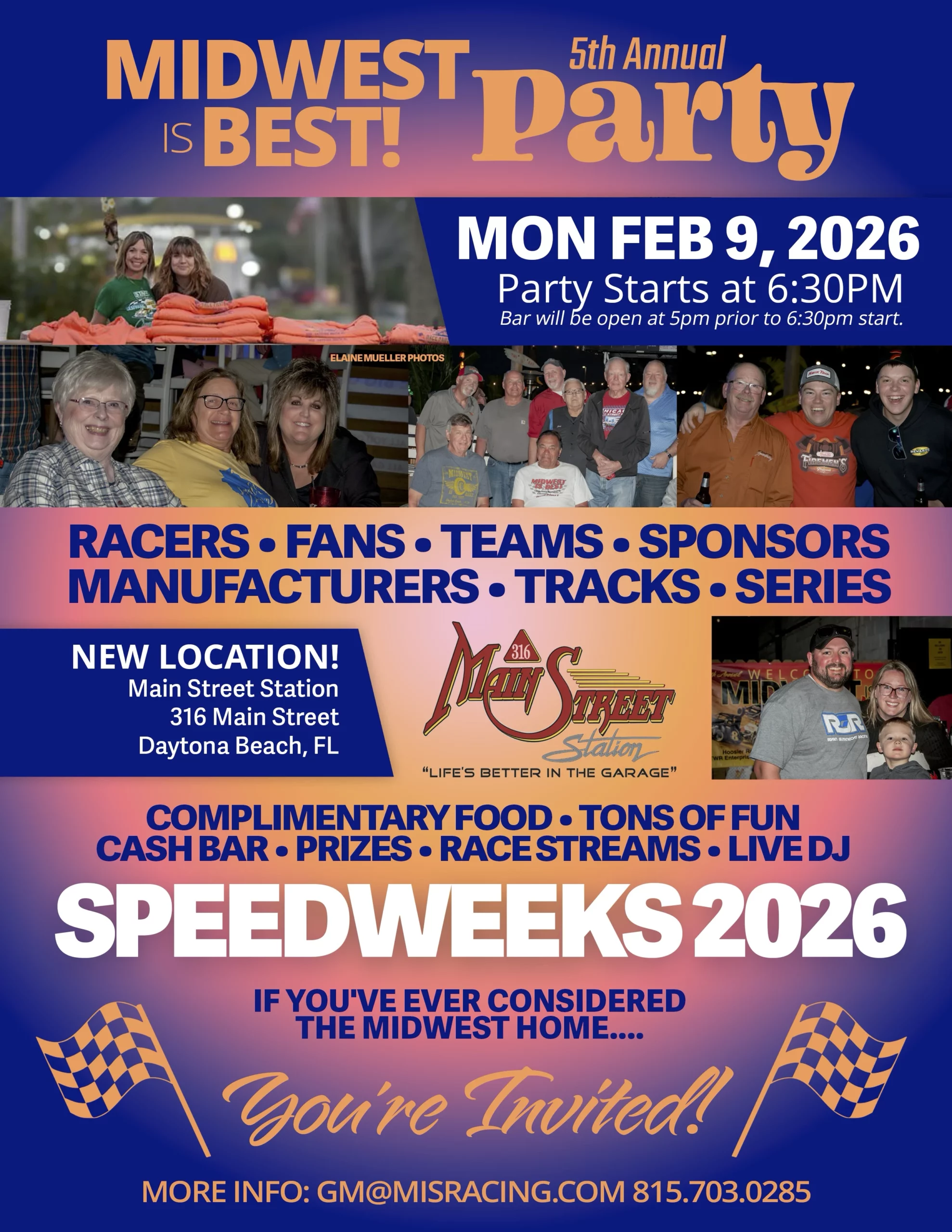 Daytona Beach, FL- The 5th annual Midwest is Best Party will take place on Monday Night February 9, 2026 at a new location, Main Street Station at 316 Main Street in Daytona Beach. The Party which invites Racers, Fans, Teams, Sponsors, Manufacturers, Tracks and Series is a revival of state parties hosted during Speedweeks forty plus years ago and continues to grow in size each year.