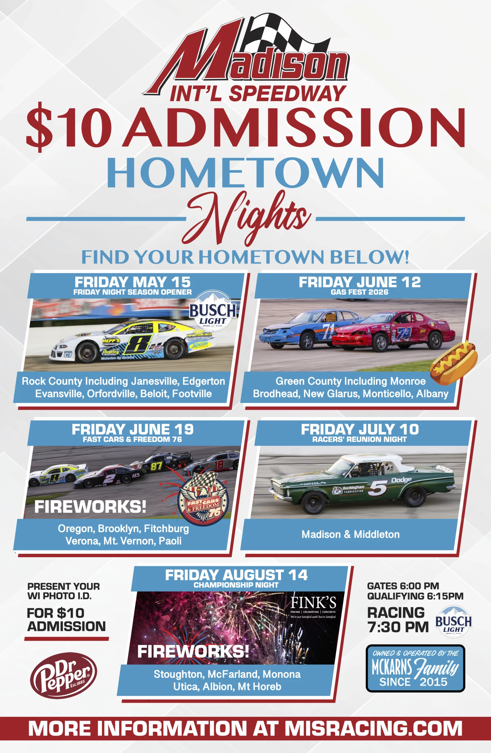 Friday, July 10 | 7:30 p.m. - Racers' Reunion Night ($10 admission for seniors ages 62 and older) with Double Features for Late Models, MISfitz, High School Racing Association plus Upper Midwest Vintage Series / Hometown Night: Madison, Middleton