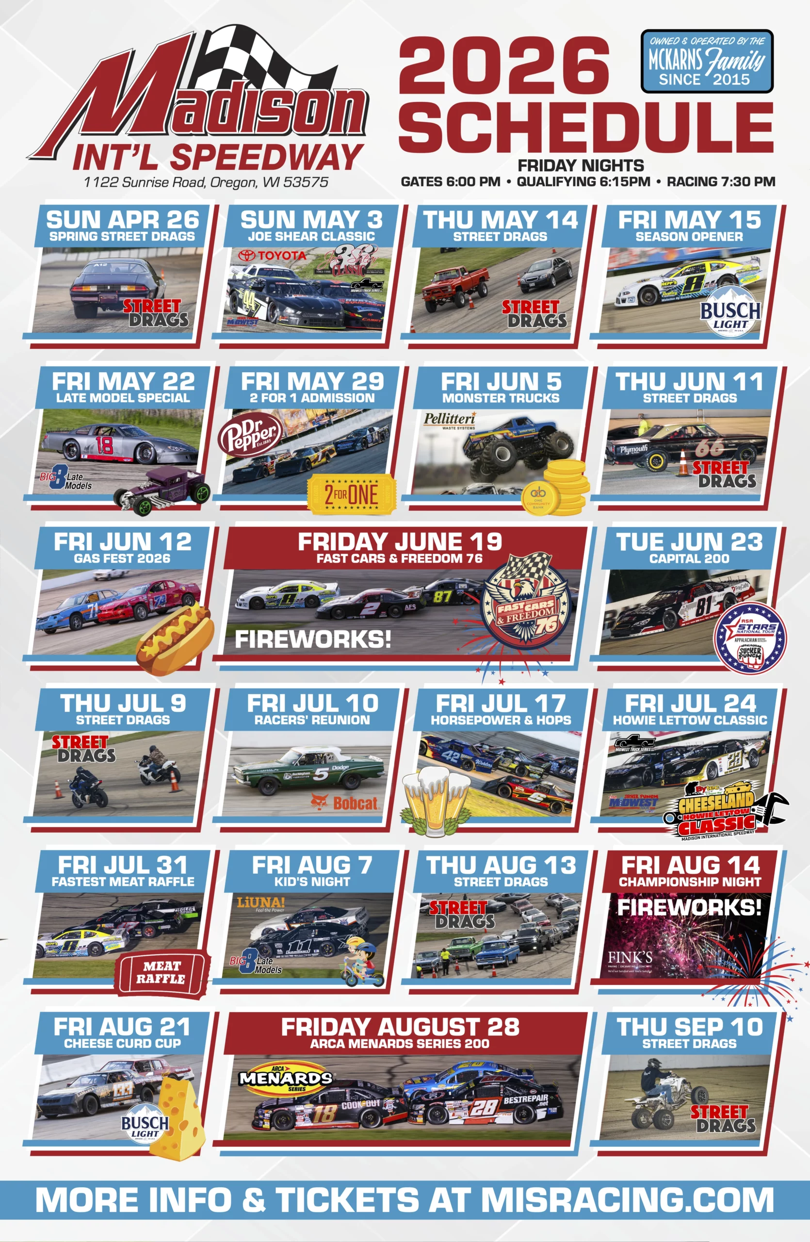 Friday, June 19 | 7:30 p.m. - Fast Cars and Freedom 76 for Weekly Late Models (Twin 38 Lap, $1776 to Win Features), MISfitz Double Features plus the Area's Biggest and Best Aerial and Ground FIREWORKS Display / Hometown Night: Oregon, Brooklyn, Fitchburg, Verona, Mt. Vernon, Paoli